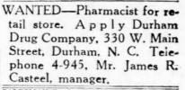 WANTED --- Pharmacist for retail store. Apply Durham Drug Company, 330 W. Main Street, Durham. N. C. Telephone 4-945. Mr. James R. Casteel, manager.