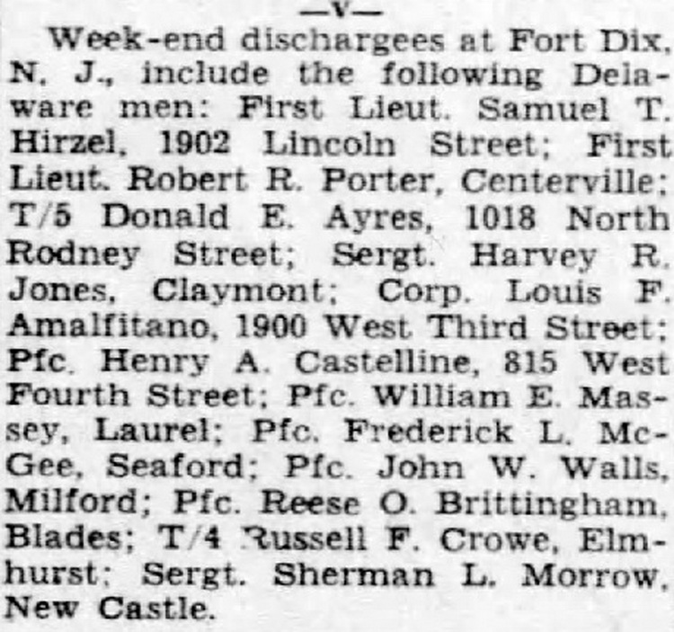 dischargees at Fort Dix, N.J. include the following Delaware men: