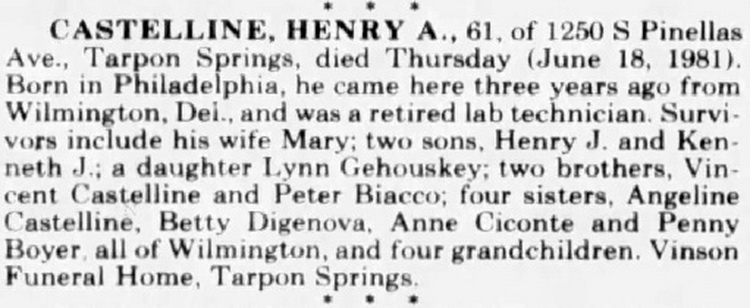 Henry A. Castelline. TARPON SPRINGS. Fla. - Henry A. Castelline. 61.