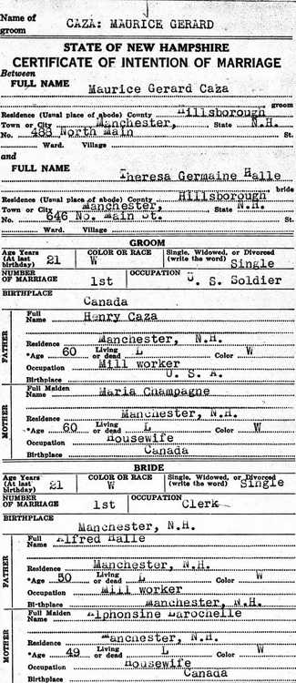married Theresa Germaine Halle in Manchester, NH on 28 December
