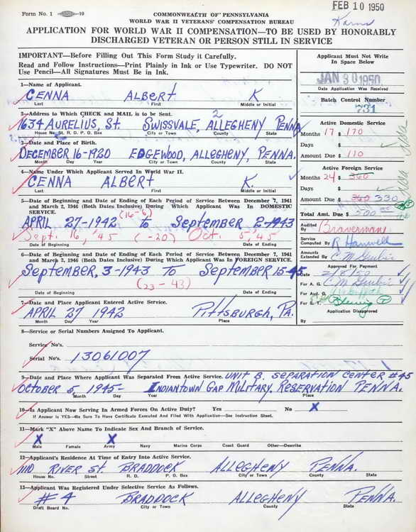 He made application for the Pennsylvania WWII Veterans Bonus on 17