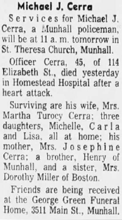 Officer Cerra, 45, of 114 Elizabeth St., died yesterday in Homestead Hospital after a heart attack.