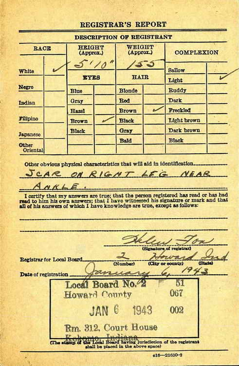 in Kokomo, IN on 6 January 1943 and was inducted into the