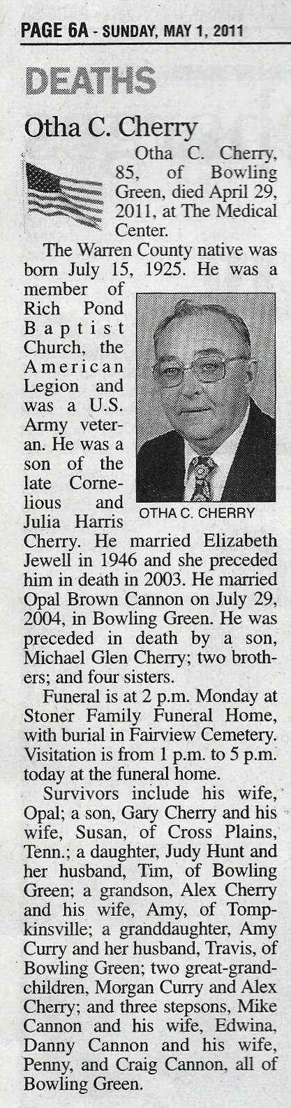 Otha C. Cherry, 85, of Bowling Green, died April 29, 2011,