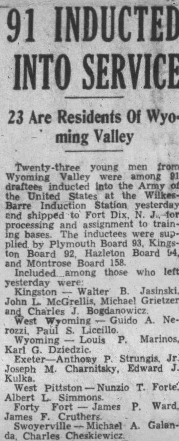 of the United States at the Wilkes-Barre Induction Station yesterday en d shipped to Fort Dix, NJ -tor processing and assignment to training bases.