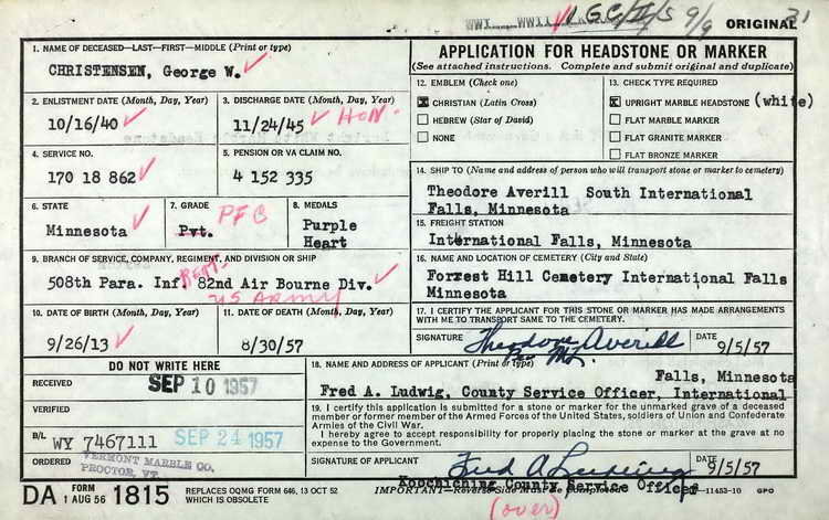 George W. Christensen to be installed in Plot 3, Section 23 NE,