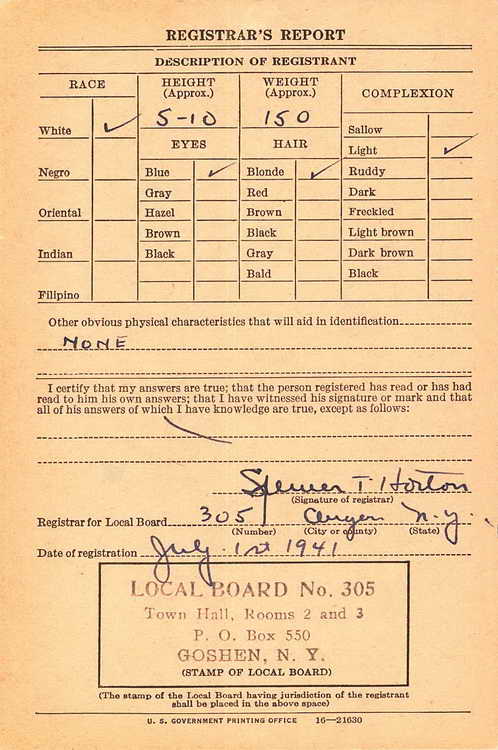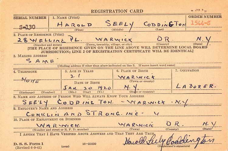 Harold registered for the draft in Goshen, NY on 1 July 1941 and was