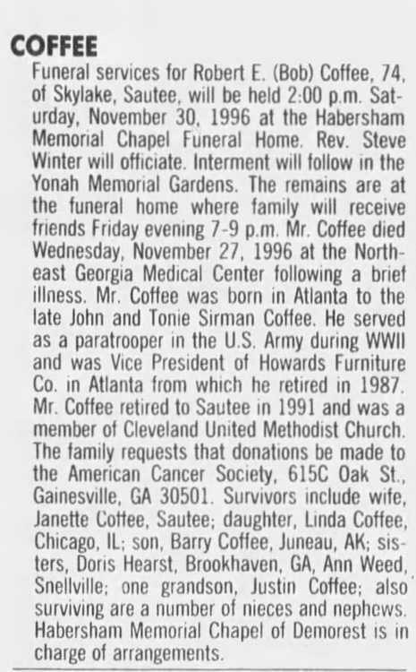 Survivors include wife, Janette Coffee, Sautee; daughter, Linda Coffee, Chicago, IL; son, Barry Coffee, Juneau, AK; sisters, Doris Hearst, Brookhaven, GA, Ann Weed, Snellville; one grandson, Justin Coffee; also surviving are a number of nieces and nephews.
