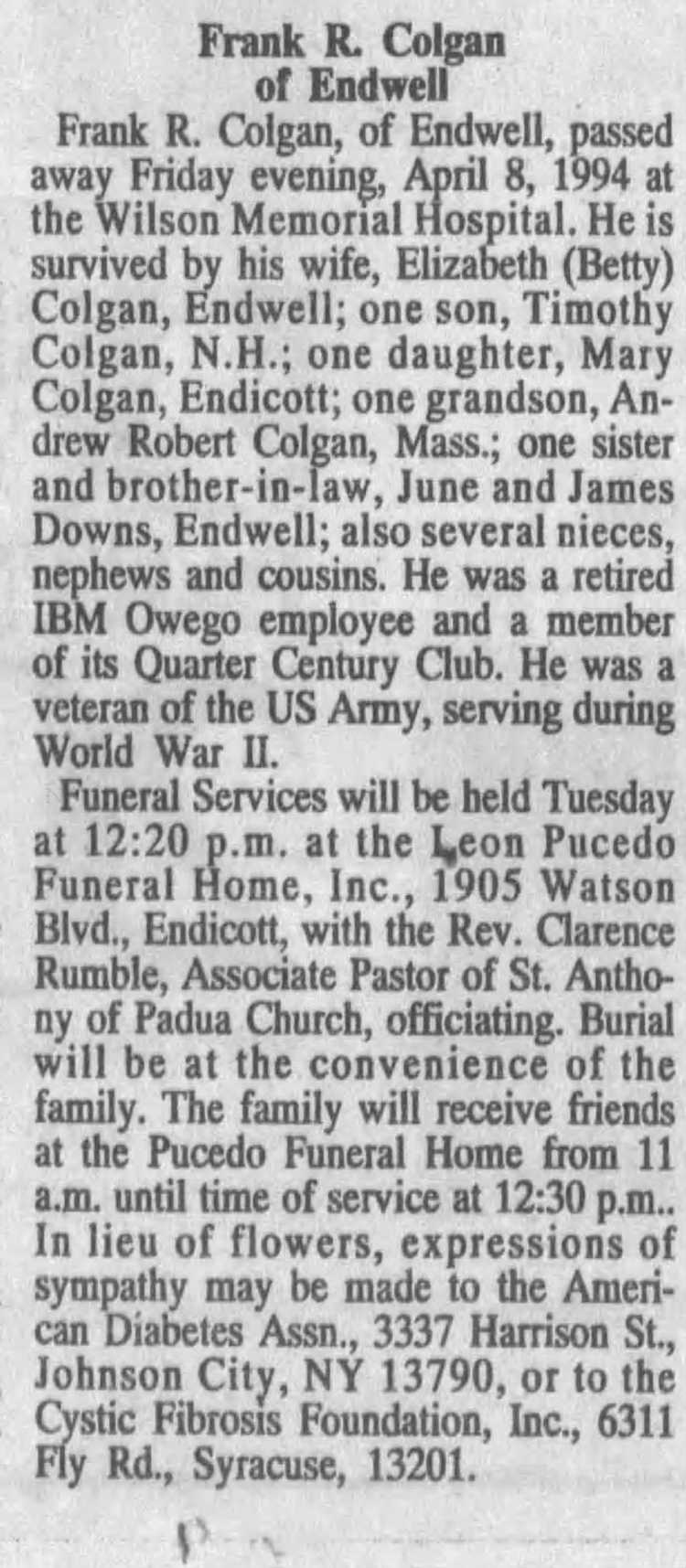 N.H.; one daughter, Mary Colgan, Endicott; one grandson, Andrew Robert