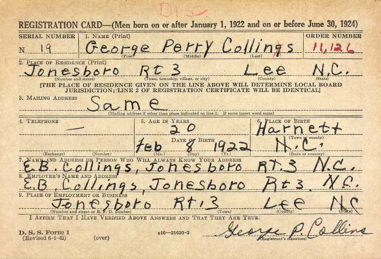 Draft registration card for George P. Collins then living