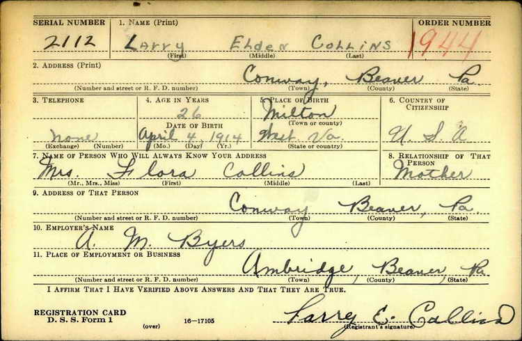 Draft Registration Card for Larry E. Collins.