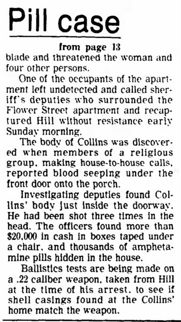 Investigating deputies found Collins' body just inside the doorway. He had been shot three times in the head. The officers found more than S20.000 in cash in boxes taped under a chair, and thousands of amphetamine pills hidden in the house.