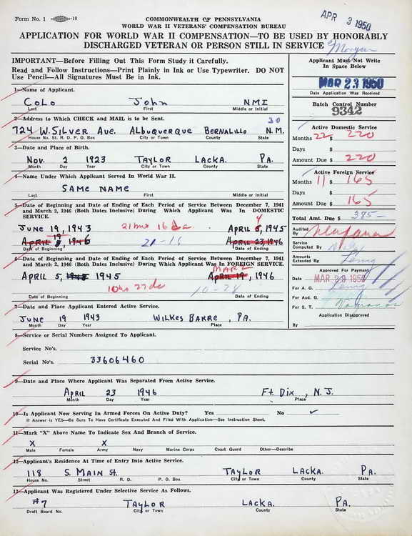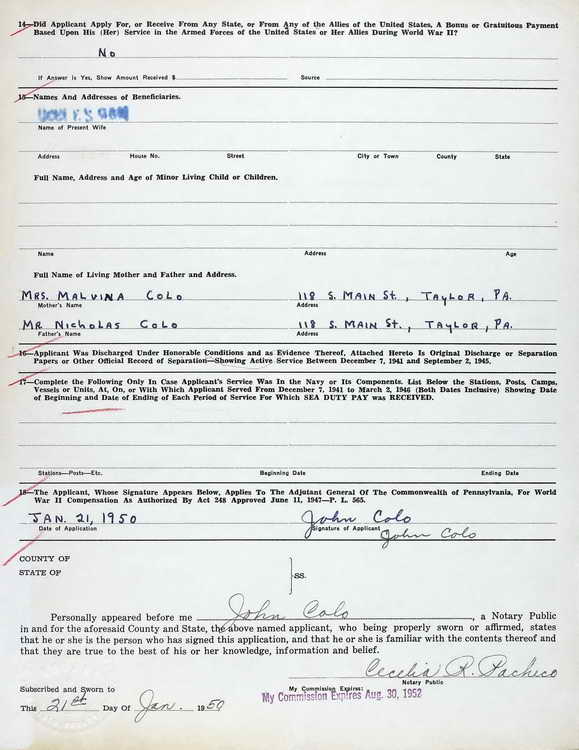 Pennsylvania WWII Veterans Bonus Application