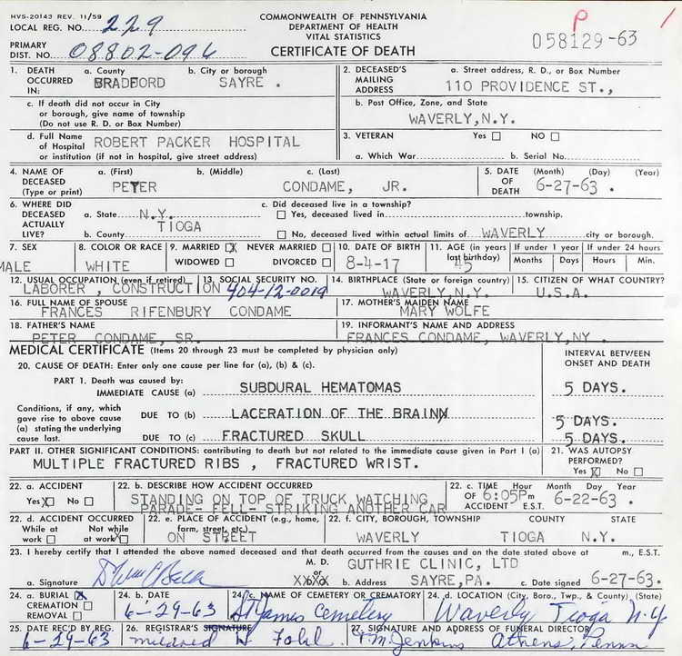 for Peter A. Condame Saint James Cemetery, Waverly (Tioga county),
