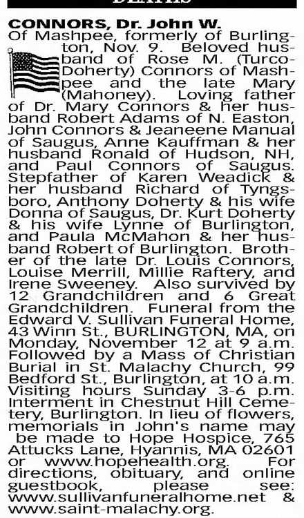 husband Robert of Burlington. Brother of the late Dr. Louis Connors, Louise Merrill, Millie Raftery, and Irene Sweeney. Also survived by 12 Grandchildren and 6 Great Grandchildren. Funeral from the Edward V. Sullivan Funeral Home, 4-3 Winn St., BURLINGTON, MA, on Monday, November 12 at 9 a.m. Followed by a Mass of Christian Burial in St. Malachy Church, 99 Bedford St., Burlington, at 10 a.m. Visiting hours Sunday 3-6 p.m. Interment in Chestnut Hill Cemetery, Burlington. In lieu of flowers, memorials in John's name may be made to Hope Hospice, 765 Attucks Lane, Hyannis, MA 02601 or www. hopeheaIth.org. For directions, obituary, and online guestbook, please see: www.sullivanfuneralhome.net & www.saint-malachy.org.