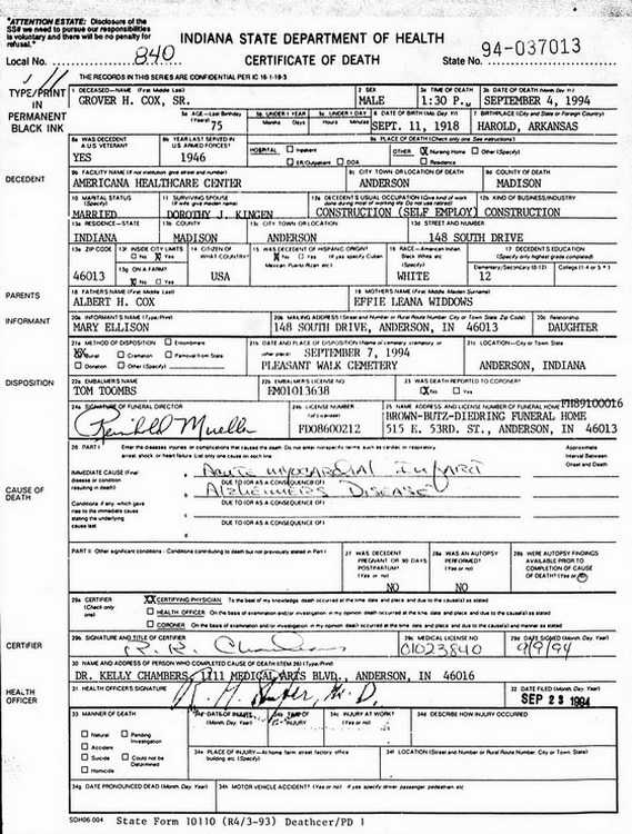 GROVER ft COX SR. Grover H. Cox, Sr., 75. 148 S. Drive, Anderson, died Sunday at the Americana Healthcare Center In Anderson. He was born Sept. 11, 1918, In Harold, Ark. Ha moved to Anderson from Missouri and had lived in the Middletown- Alexandria- Anderson area most of his