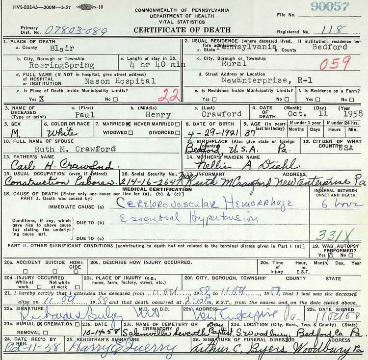 Paul H. Crawford in Salemville Cemetery, Salemville (Bedford