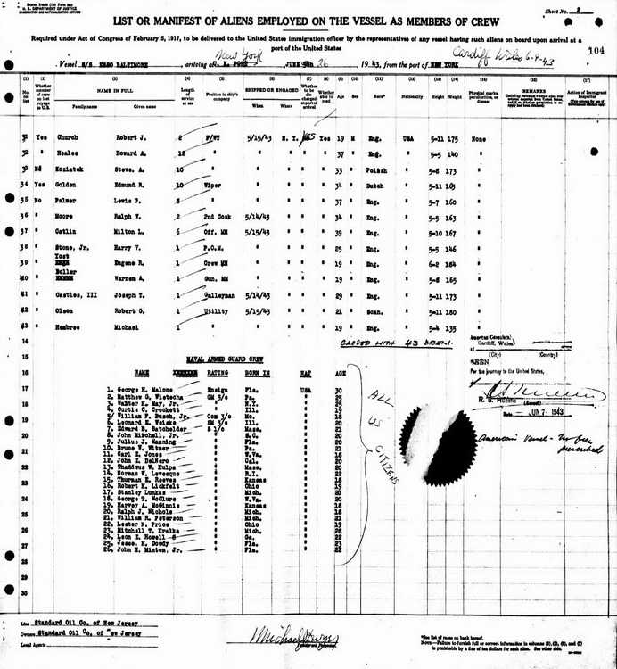 served as a gunner's mate aboard the SS Esso Baltimore as shown on