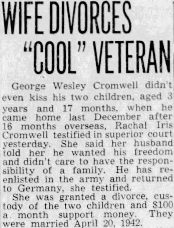 George Wesley Cromwell didn't1 even kiss his two children, aged 3 years and 17 months. when he came home last December after 16 months overseas, Rachal Iris Cromwell testified in superior court' yesterday. She said her husband' told her he wanted his freedom and didn't care to have the responsibility of a family. He has re-, enlisted in the army and returned to Germany, she testified.