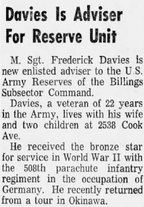 He received the bronze star for service in World War II with the 508th parachute infantry regiment in the occupation of Germany. He recently returned from a tour in Okinawa.