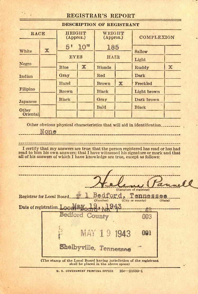 draft in Shelbyville, TN on 19 May 1943 and was inducted into the Army