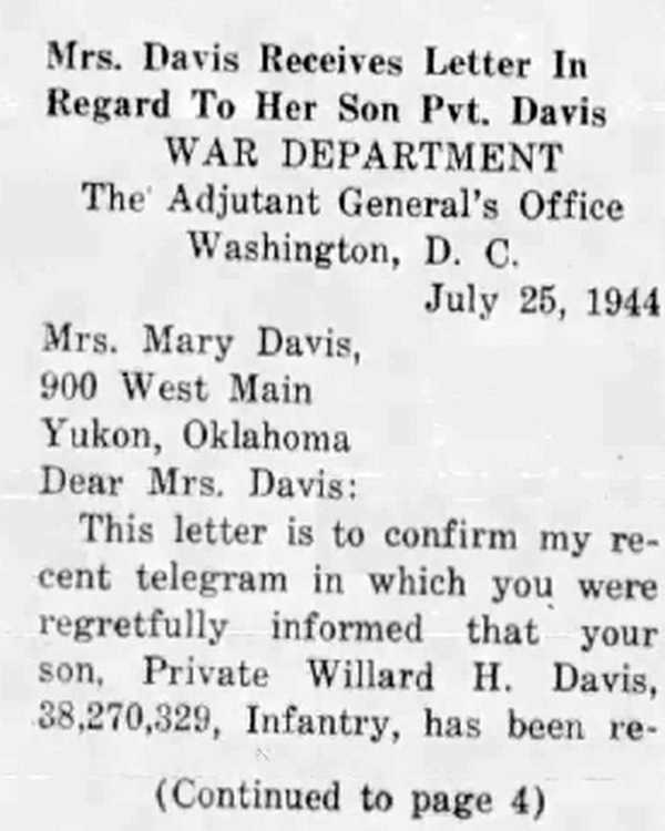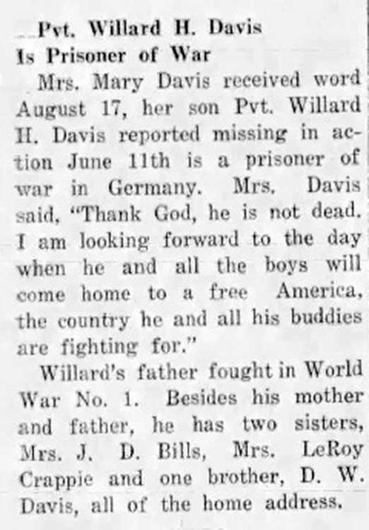 Mrs. Mary Davis received word August 17, her son Pvt Willard Davis reported missing in