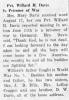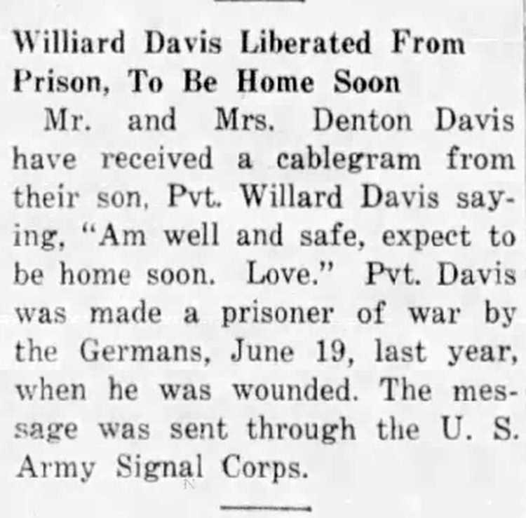 received a cablegram from their son Pvt Willard Davis saying “Am well and safe expect to be home soon Love”