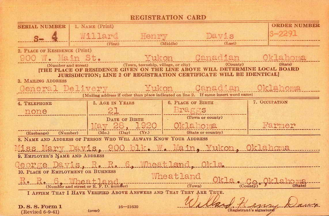 marker for Willard H. Davis in Yukon Cemetery, Yukon (Canadian county),