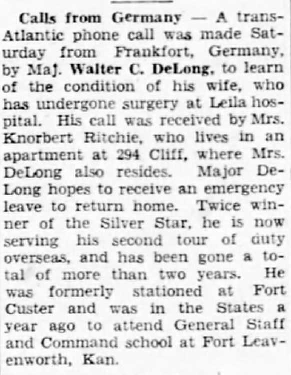 Germany, by Maj. Walter C DeLong. to learn of the condition of his wife,