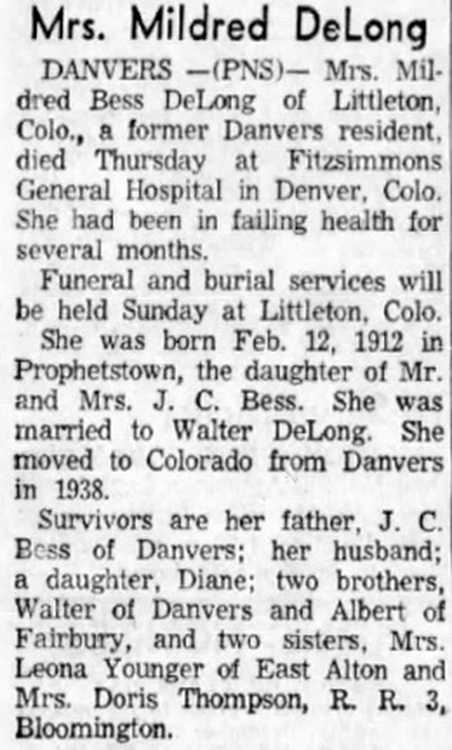 DeLong. She moved to Colorado from Danvers in 1938. Survivors are her