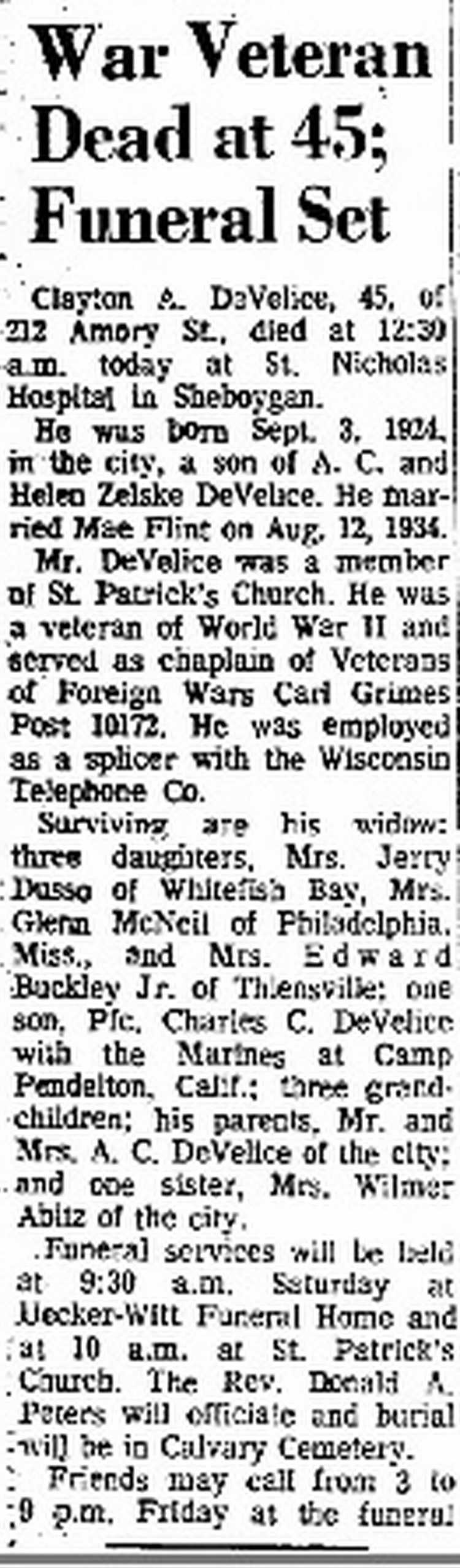 Jr. of Thiensville; one son, Pfc. Charles C. DeVelice with the Marines