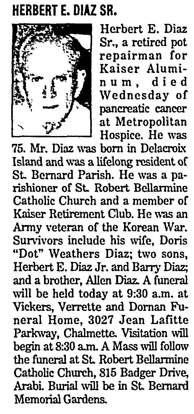 Mr. Diaz was born in Delacroix Island and was a lifelong resident of St.