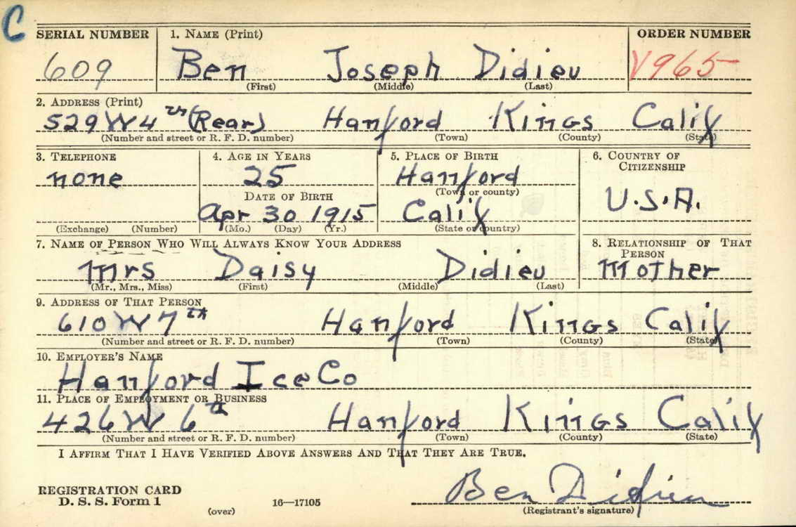 A lifetime resident of Hanford, Mr. Didieu worked for 28 years as a truck driver for Sears, Roebuck & Co. before his retirement. He served in the U.S. Army during World War II and was a member of the Hanford post of the American Legion.
