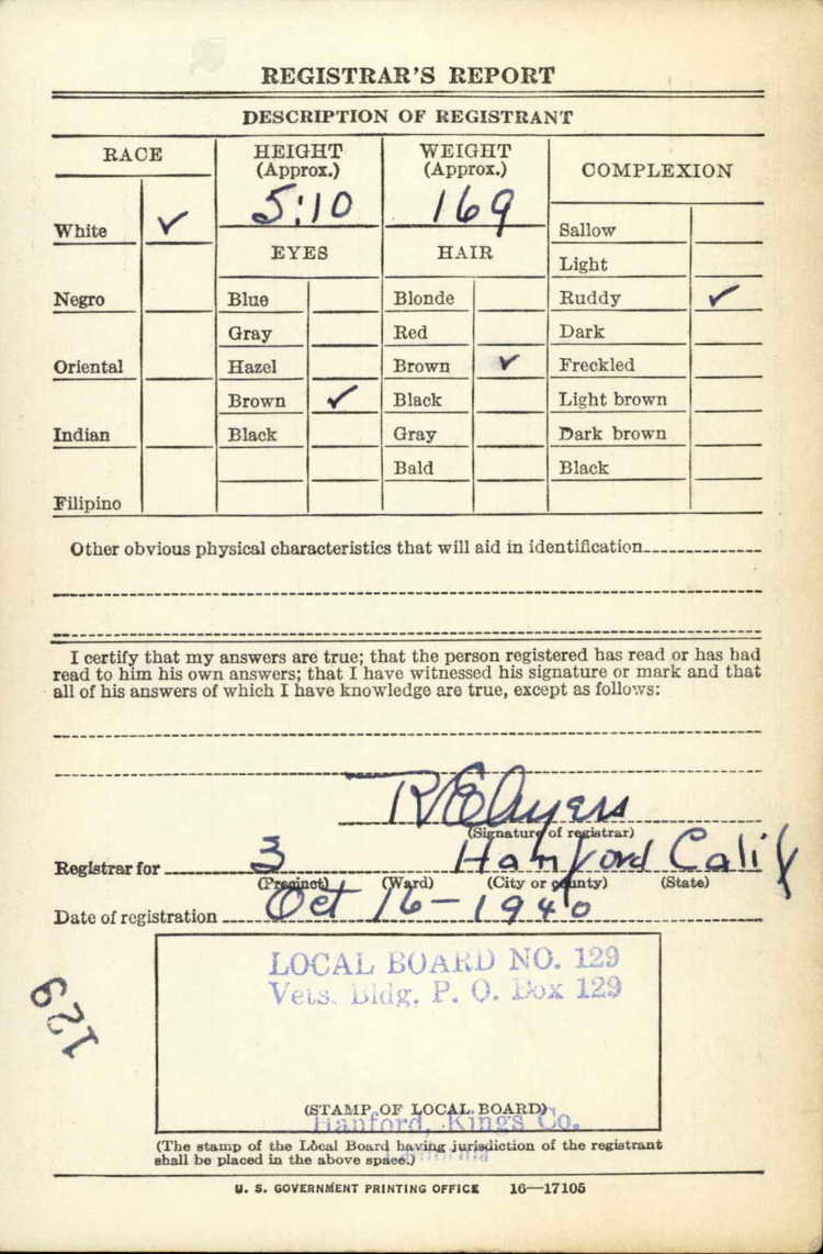 Hanford, CA on 16 October 1940 and was inducted into the Army on 14