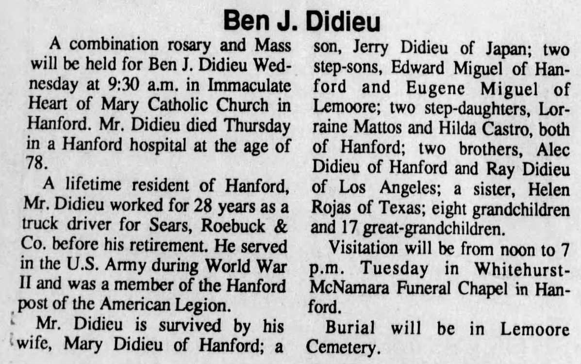 Mr. Didieu is survived by his wife, Mary Didieu of Hanford; a Didieu son, Jerry Didieu of Japan; two step-sons, Edward Miguel of Hanford and Eugene Miguel of Lemoore; two step-daughters, Lorraine Mattos and Hilda Castro, both of Hanford; two brothers, Alec Didieu of Hanford and Ray Didieu of Los Angeles; a sister, Helen Rojas of Texas; eight grandchildren and 17 great-grandchildren.