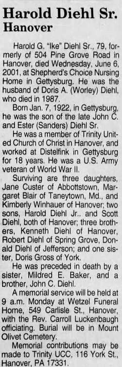 "Ike" Diehl Sr., 79, formerly of 504 Pine Grove Road in Hanover, died Wednesday, June 6, 2001, at Shepherds Choice Nursing Home in Gettysburg. He was the husband of Doris A. (Worley) Diehl, who died in 1987.