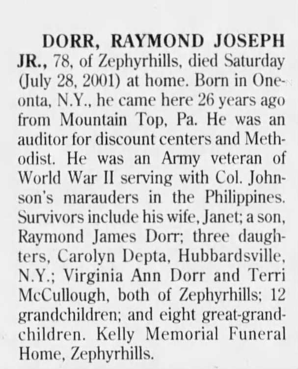 home. Born in Oneonta, N.Y., he came here 26 years ago from Mountain Top, Pa. He was an auditor for discount centers and Methodist. He was an Army veteran of World War II serving with Col. Johnson's marauders in the Philippines. Survivors include his wife, Janet; a son, Raymond James Dorr; three daughters, Carolyn Depta, Hubbardsville, N.Y.; Virginia Ann Dorr and Terri McCullough, both of Zephyrhills; 12 grandchildren; and eight great-grandchildren. Kelly Memorial Funeral Home, Zephyrhills.