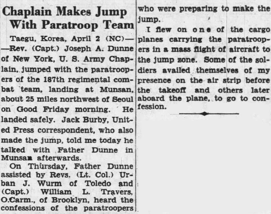Taegu, Korea, April 2 (NC --- Rev. (Capt.) Joseph A; Dunne of New York, U. S. Army Chaplain,, jumped with the paratroopers of the 187th regimental combat 'team, landing at Munsan, about 25 miles northwest of Seoul on Good . Friday morning. ' He landed safely. Jack Burby, United Press correspondent, who also made the jump, told me today he talked with .Father Dunne in