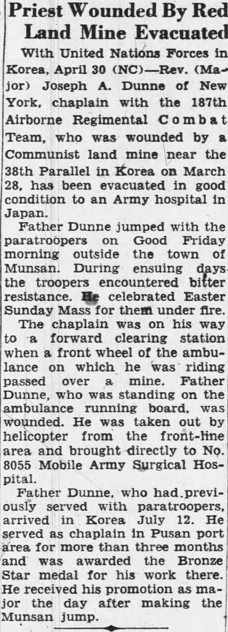 .Father Dunne, who had. previously served with paratroopers, arrived in