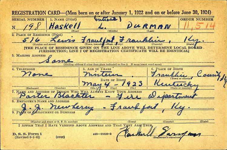 Frankfort, KY on 39 June 1942 and was inducted into the Army at Fort