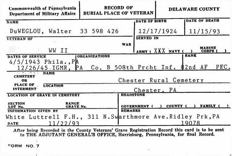 Pennsylvania Record of Burial for Walter DuWeglou in the