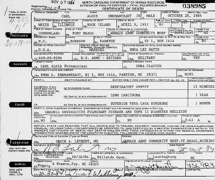 died in the Womack Army Hospital, Fort Bragg (Cumberland), NC, on 29