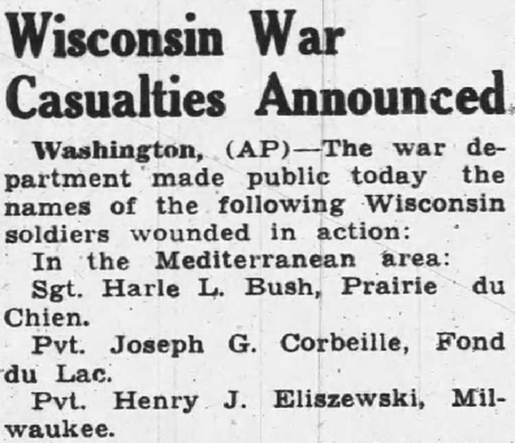 Herald-Telegram, Chippewa Falls, Wisconsin on 14 Apr 1944 listed Pvt