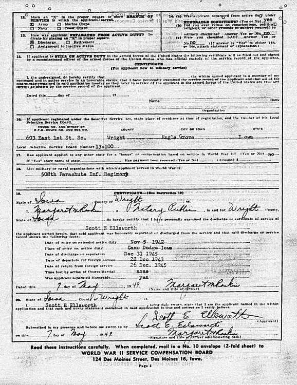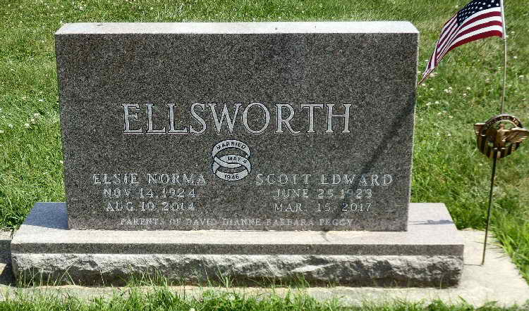Scott Edward (Ed) Ellsworth was born at home in Eagle Grove, Iowa, son of Scott M. and Ruth N. (Pletcher) Ellsworth, on June 25, 1923. He was baptized in the First Baptist Church in Eagle Grove. Growing up he worked in the shop of his father's car dealership. In high school, he was an over-the-road driver, transporting cars from Detroit.