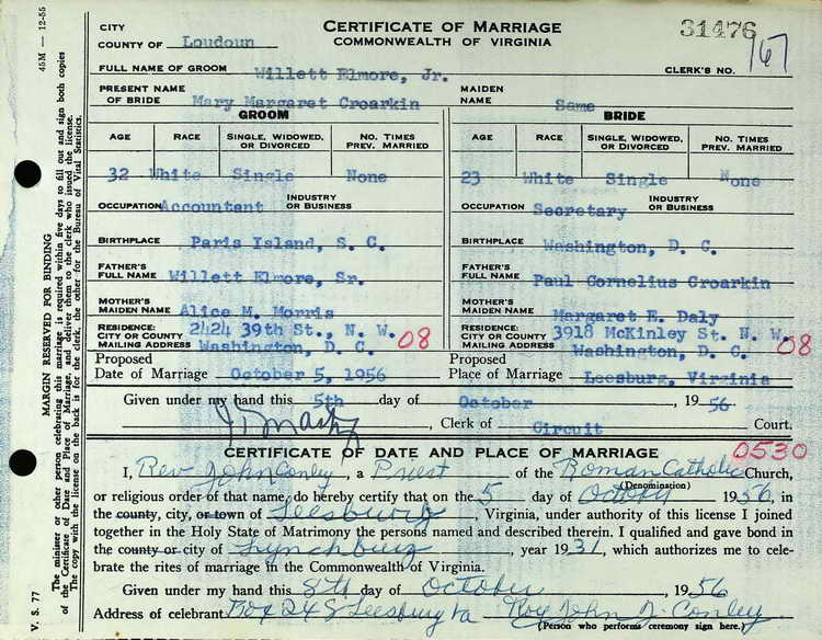 married Mary Margaret Croarkin in Leesburg, VA on 5 October 1956. |