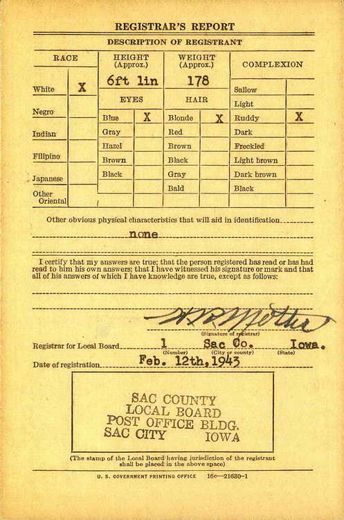 February 1943 and was inducted into the Army at Camp Dodge, Herrold, IA