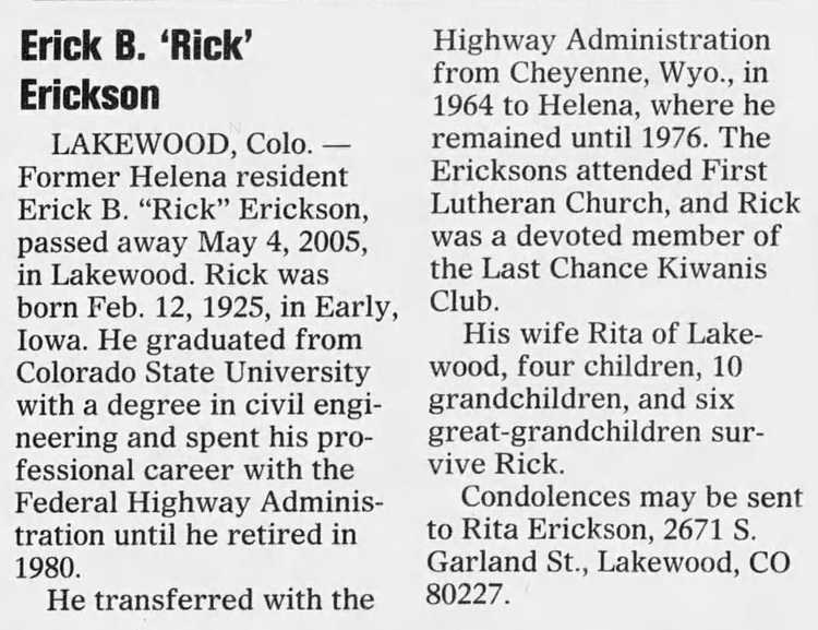 LAKEWOOD, Colo. Former Helena resident Erick B. "Rick" Erickson, passed away May 4, 2005, in Lakewood. Rick was born Feb. 12, 1925, in Early, Iowa. He graduated from Colorado State University with a degree in civil engineering and spent his professional career with the Federal Highway Administration until he retired in 1980.