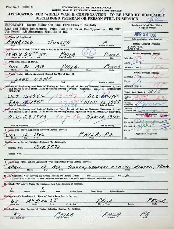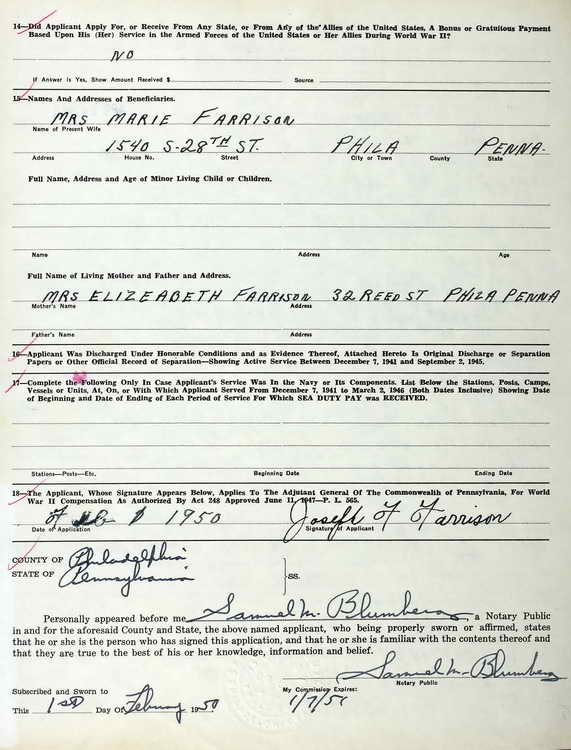 submitted a Pennsylvania WWII Veteran Bonus application on 1 February