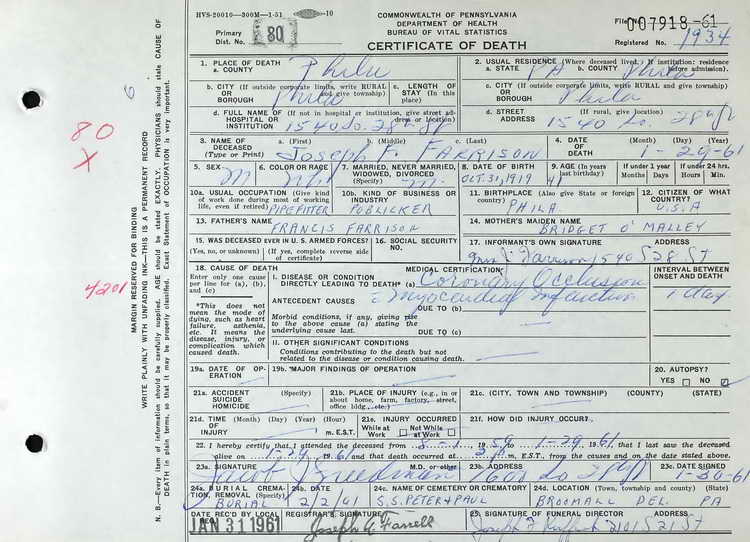 shows that Joseph succumbed to a coronary occlusion on 29