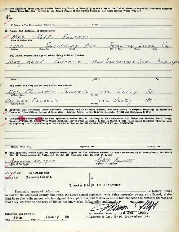 Application for Robert Fawcett completed on 13 March 1950. He received